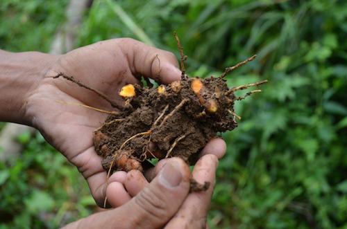 What is turmeric? To me it had it always been yellow powder in a little glass bottle with a plastic top that you buy from the supermarket. I wouldn’t know an actual turmeric plant if one passed me in the street. In fact I still haven’t seen a full turmeric plant but I do now know what the yellow dried powder’s made from — the root. Knobbly, a bit like ginger but thinner and the skin a nuttier brown. I have clasped my own eyes on one, or five in fact, which I’d just brought back from the shop.